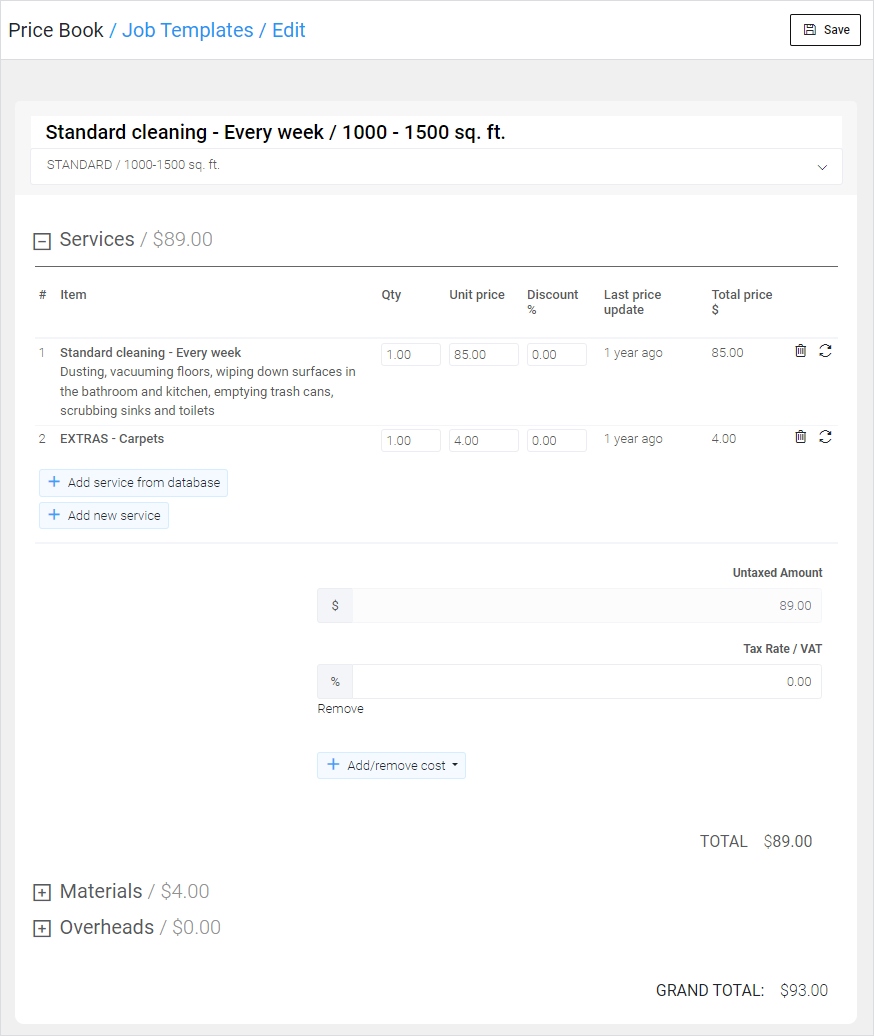 Avoid redundant and time-consuming work by using Job Templates. In 1 single template - which is part of your Price Book - you can add 1 or multiple services along with the necessary list of supplies (+ overheads if necessary). This is a fantastic tool to define both simple and very complex jobs that include a suite of services. Moreover, any job template can be synchronized with your services/supplies/overheads database in 1 click (the services/supplies/overheads are also part of your Price Book).