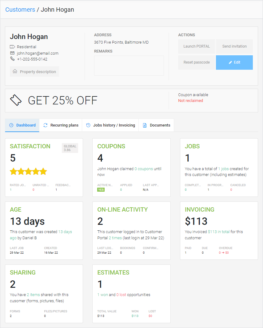 Would you like to have a history of your preferred service orders? We think you do! And we think your customers do, too! You can send invitations to any of your customers to get access to Customer Portal where, among other things, he or she will be able to see all jobs.