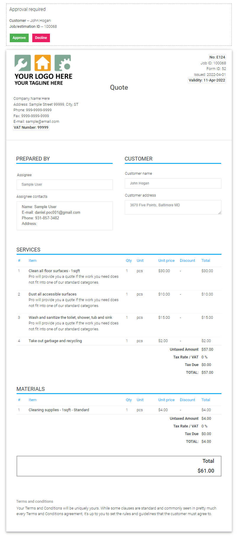 Winning a bid is never easy. HouseService 365 features Job Templates that are very versatile, allowing you to offer discounts per item, per section (services, supplies, overheads), or per job/project.