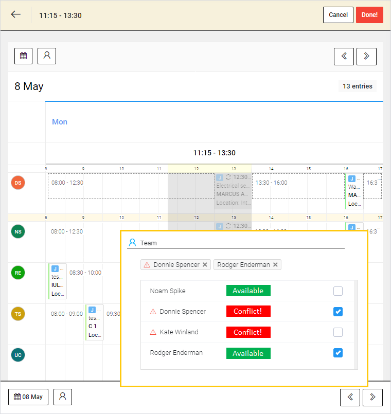 When you perform a job or estimate assignment, the job or estimate scheduler will show you the available personnel immediately. You don’t need to scroll your calendar from left to right and from top to bottom to find available people. Because they are already there!